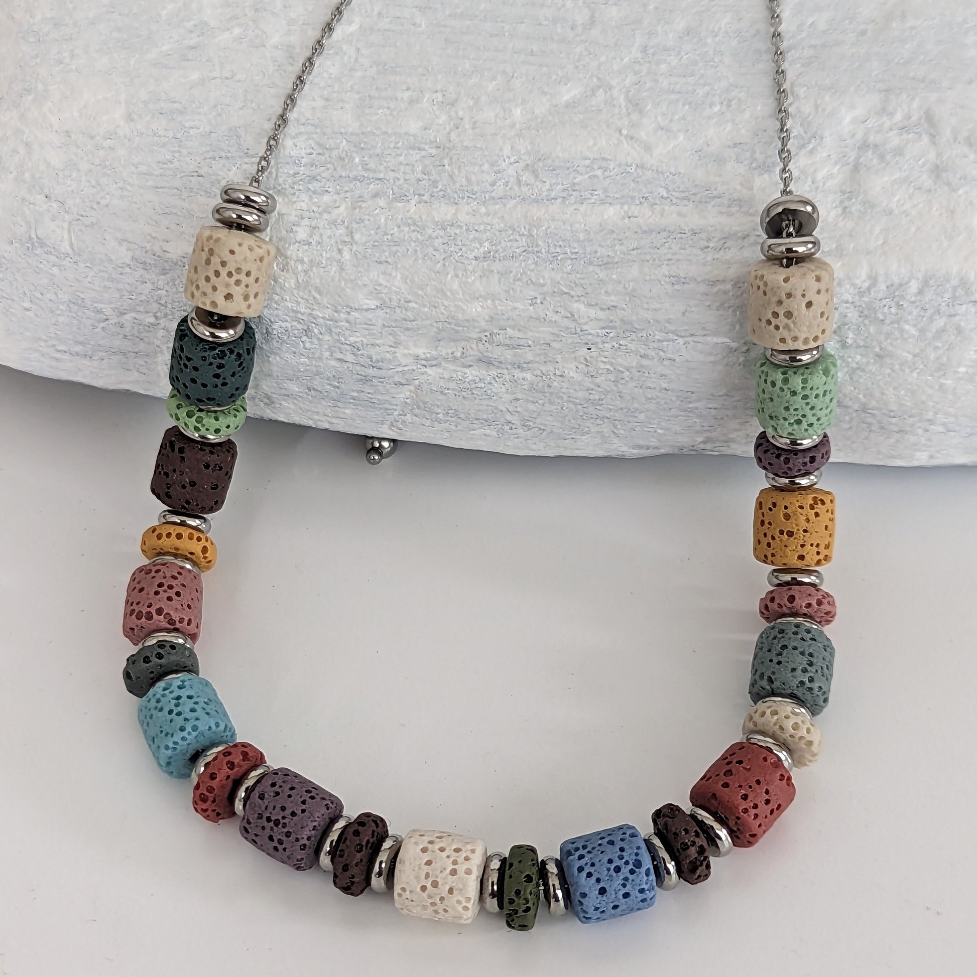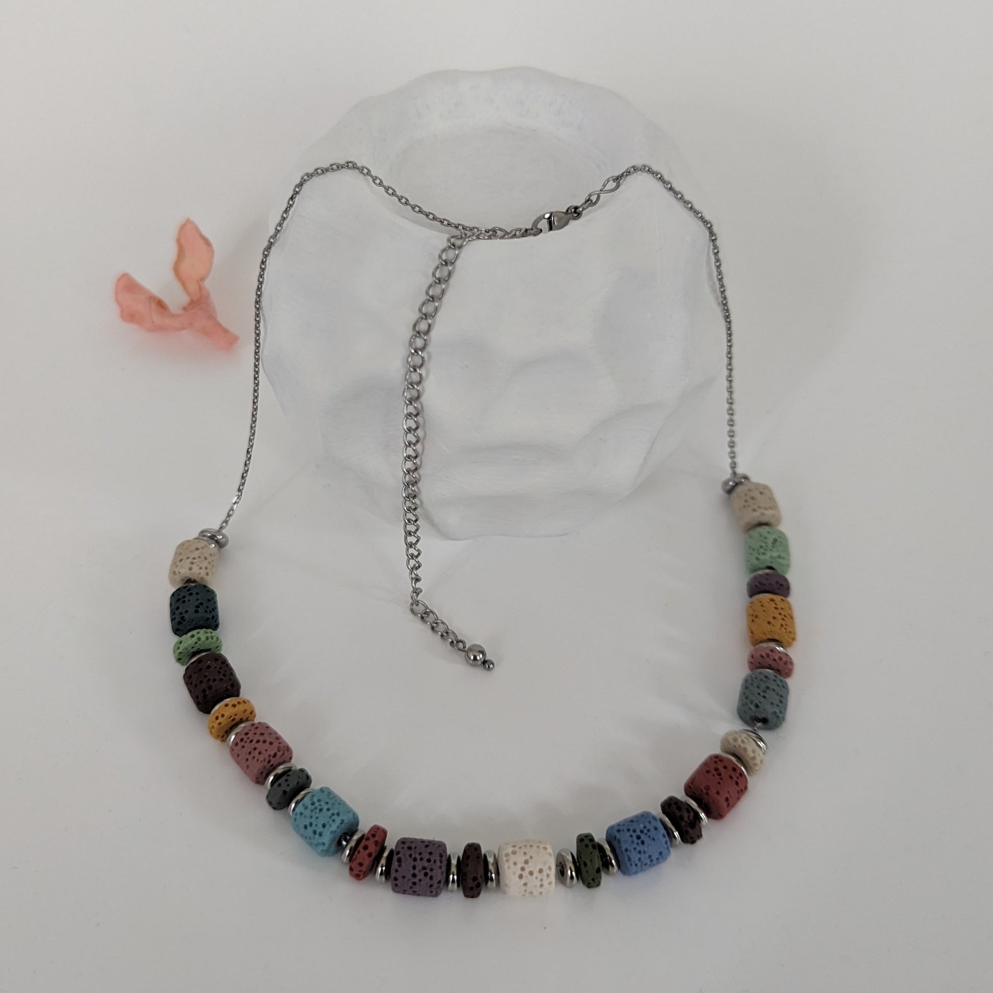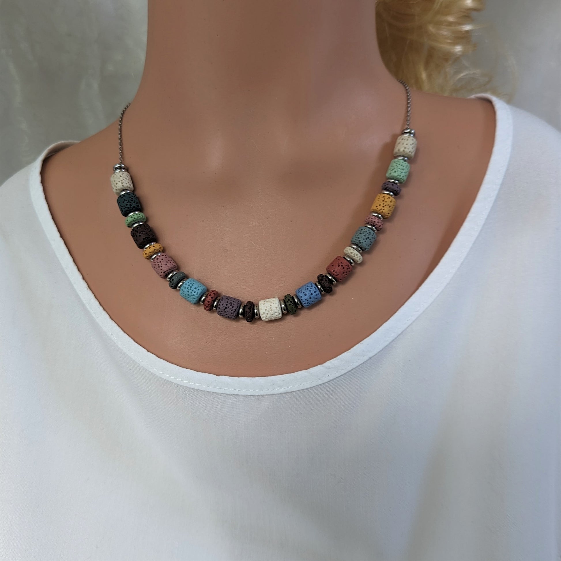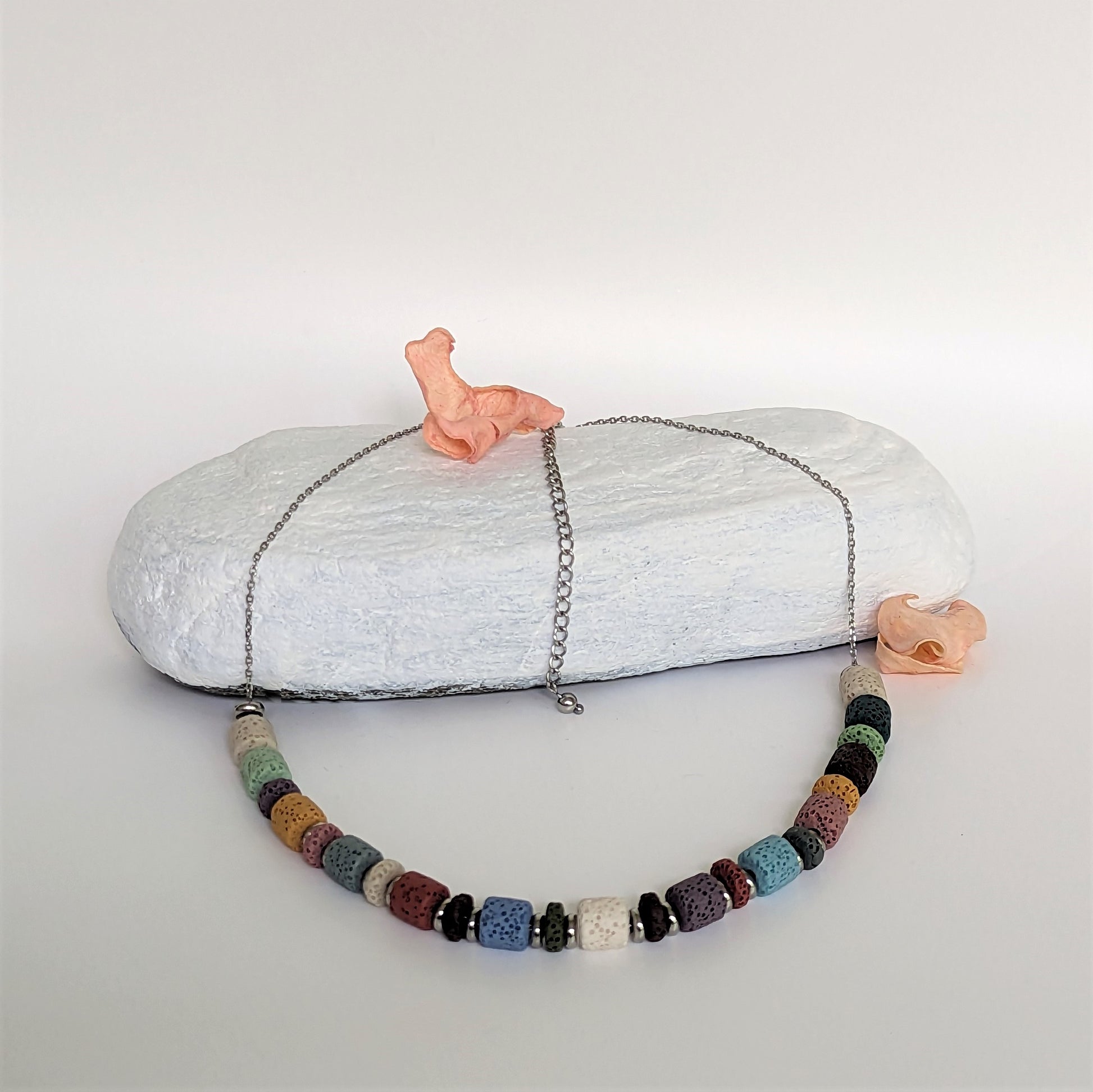 Opteaza pentru acest colier multicolor realizat din margele de lava vulcanica si lant din otel inoxidabil. Un accesoriu versatil, usor de asortat cu tinute de diverse culori.
