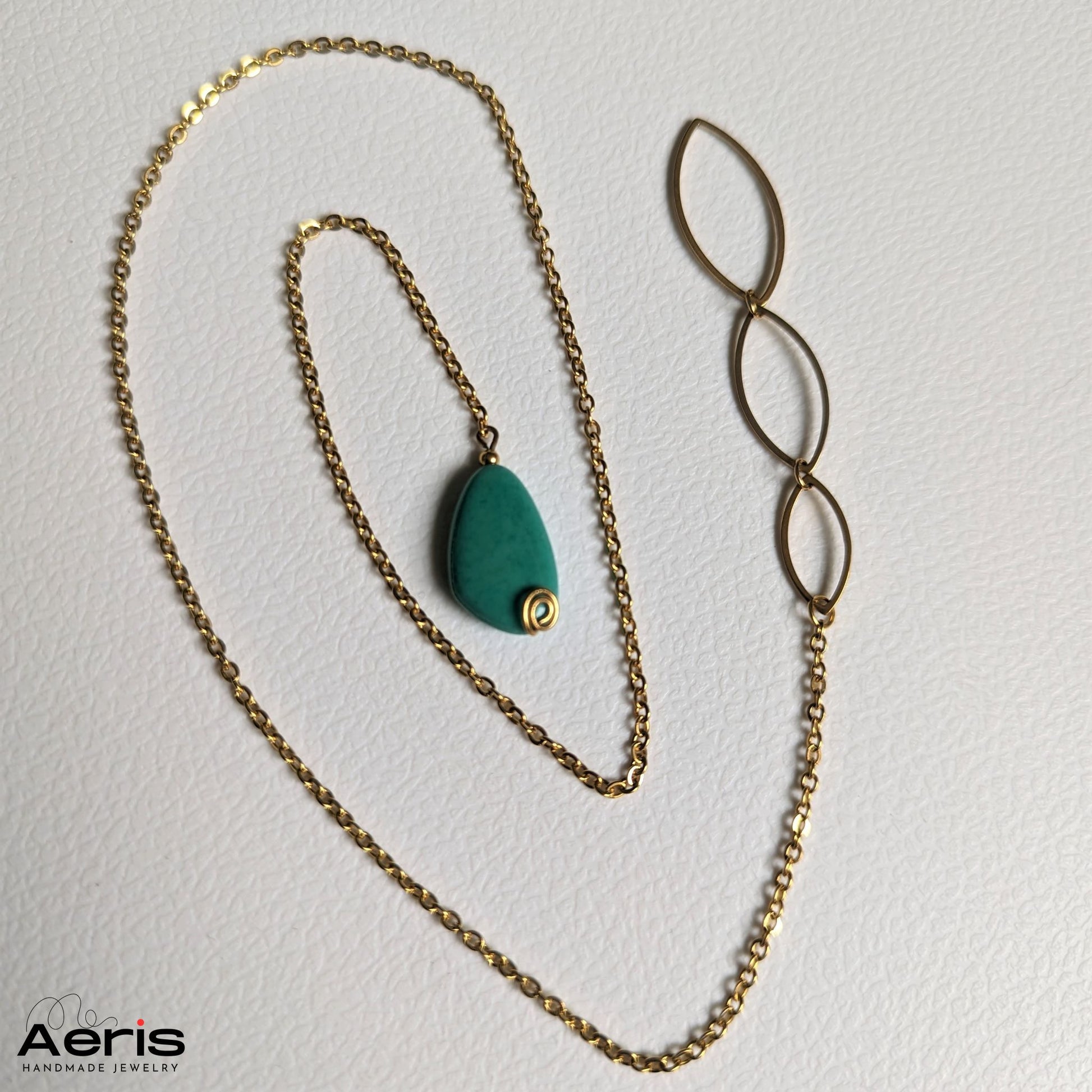 Colier cu piatra semipretioasa din coral fosil si elemente decorative din otel inoxidabil auriu. Lantul colierului este din otel inoxidabil placat cu aur de 21k.