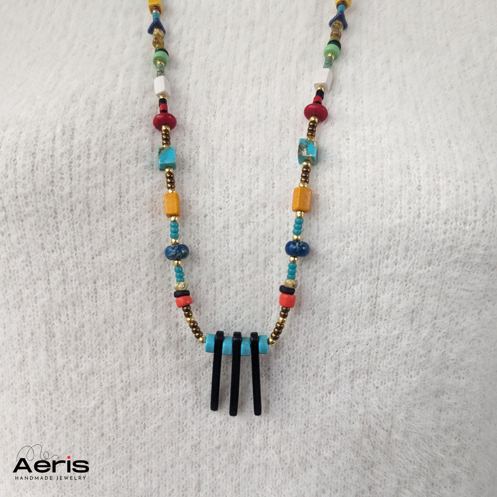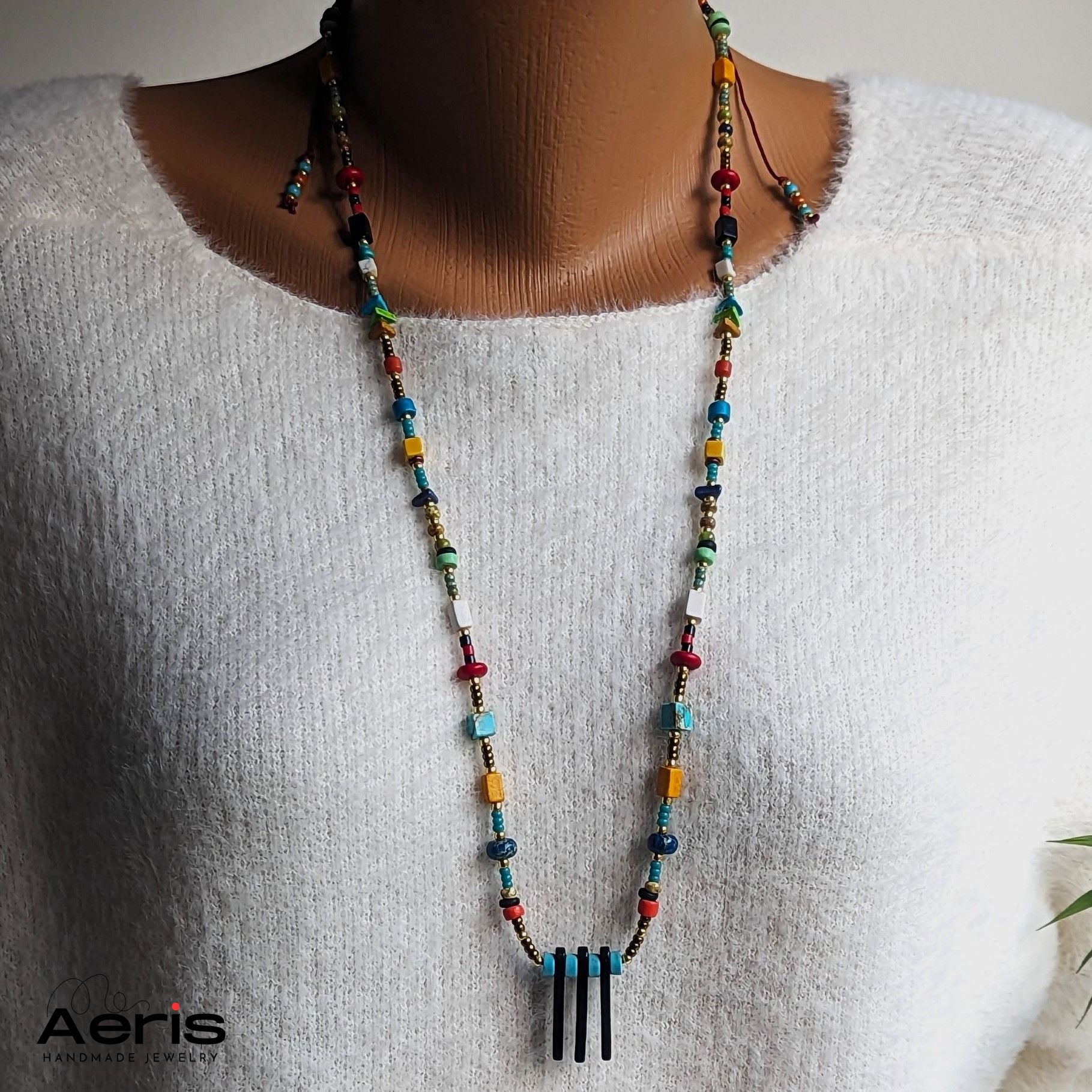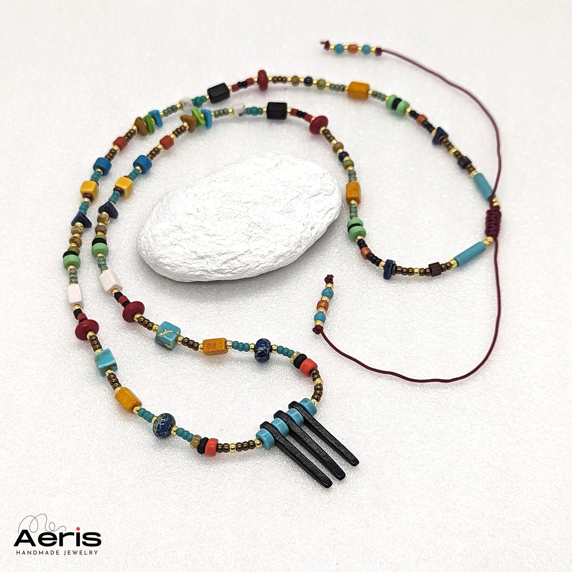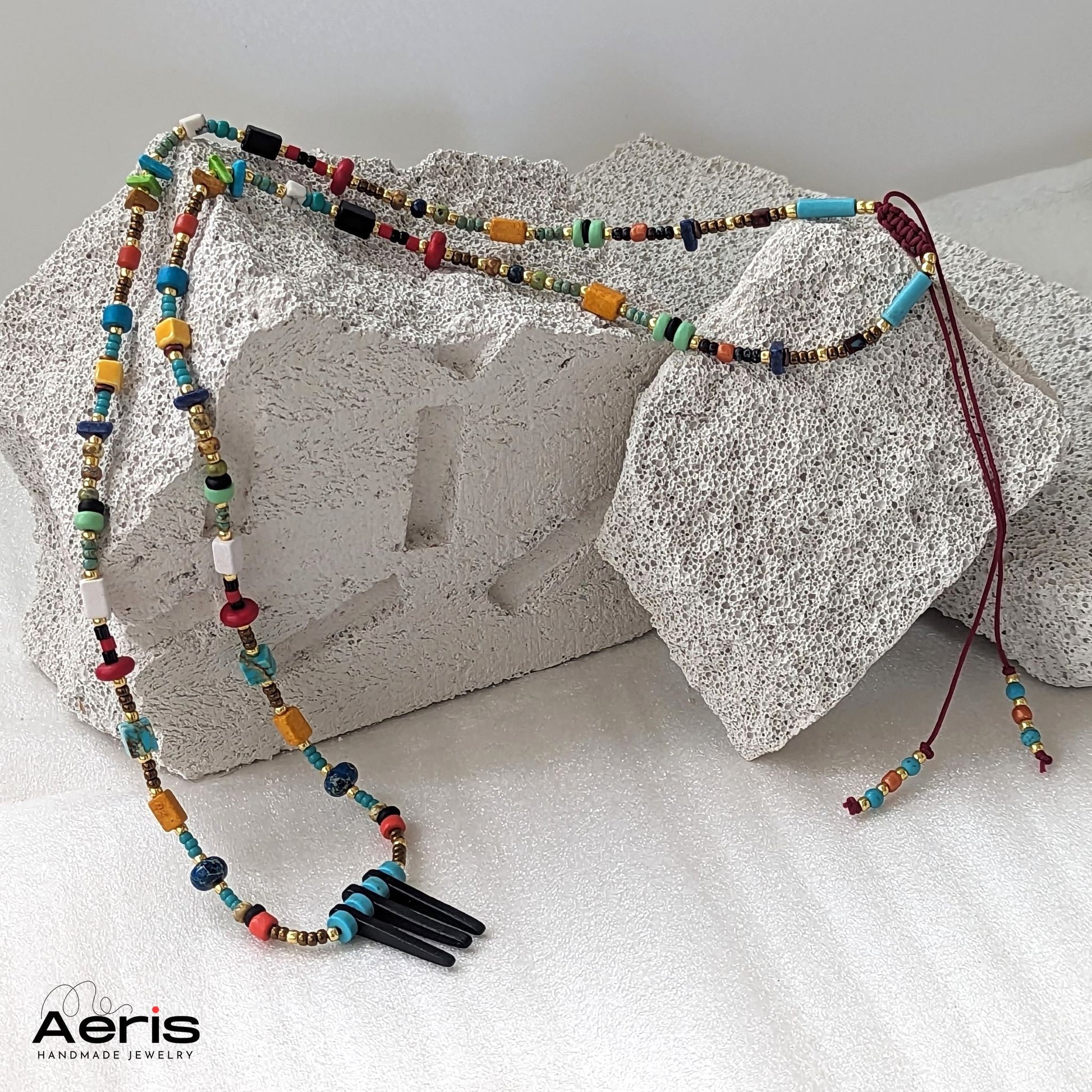 Exprima-ti spiritul boem cu acest colier realizat din margele de ceramica si semipretioase, margele spacer Miyuki placate cu aur de 24k si margele de nisip egale ca forma si marime. Margelele sunt inserate pe un snur foarte rezistent, incheiat la spate printr-o impletitura tip macrame, realizata tot din snur.
