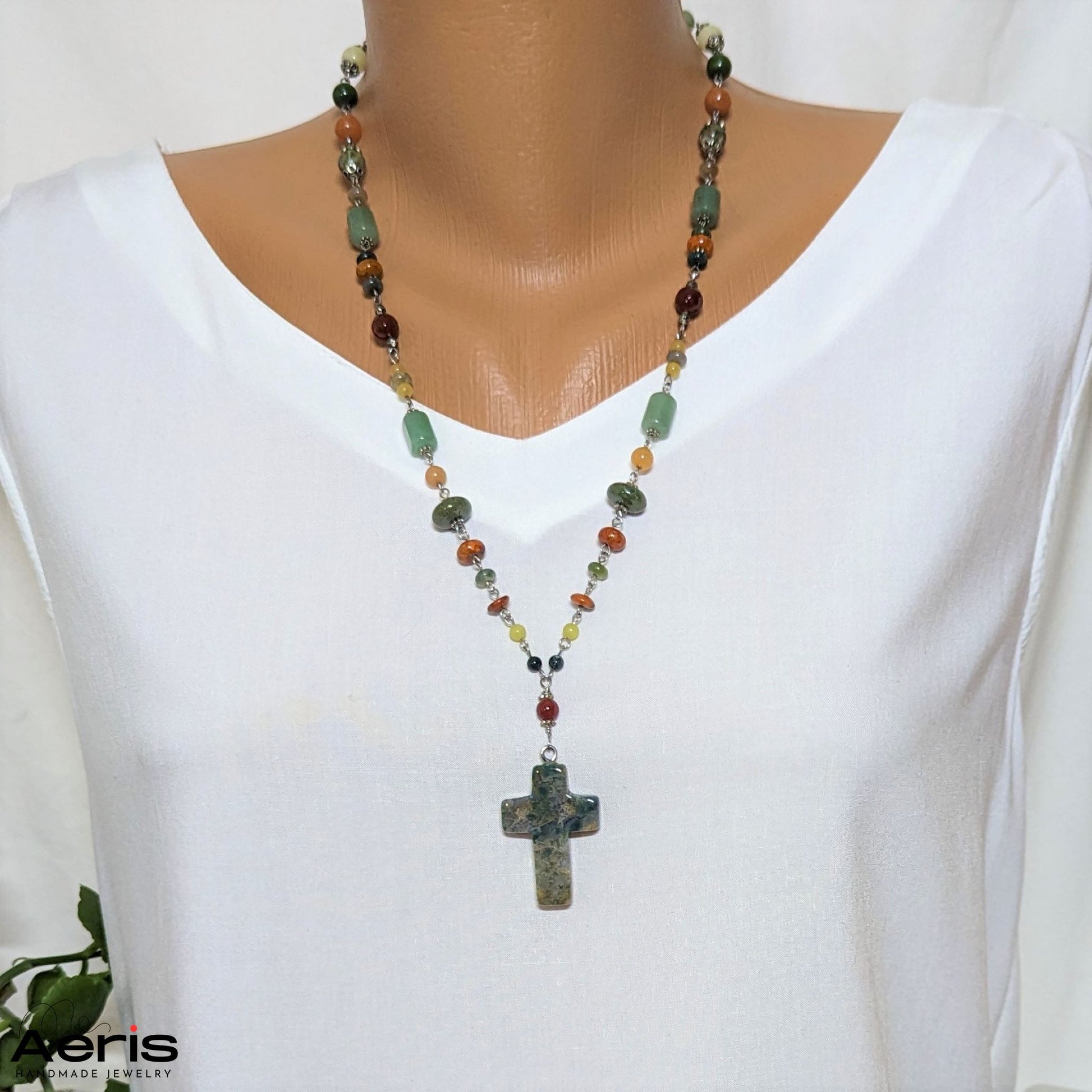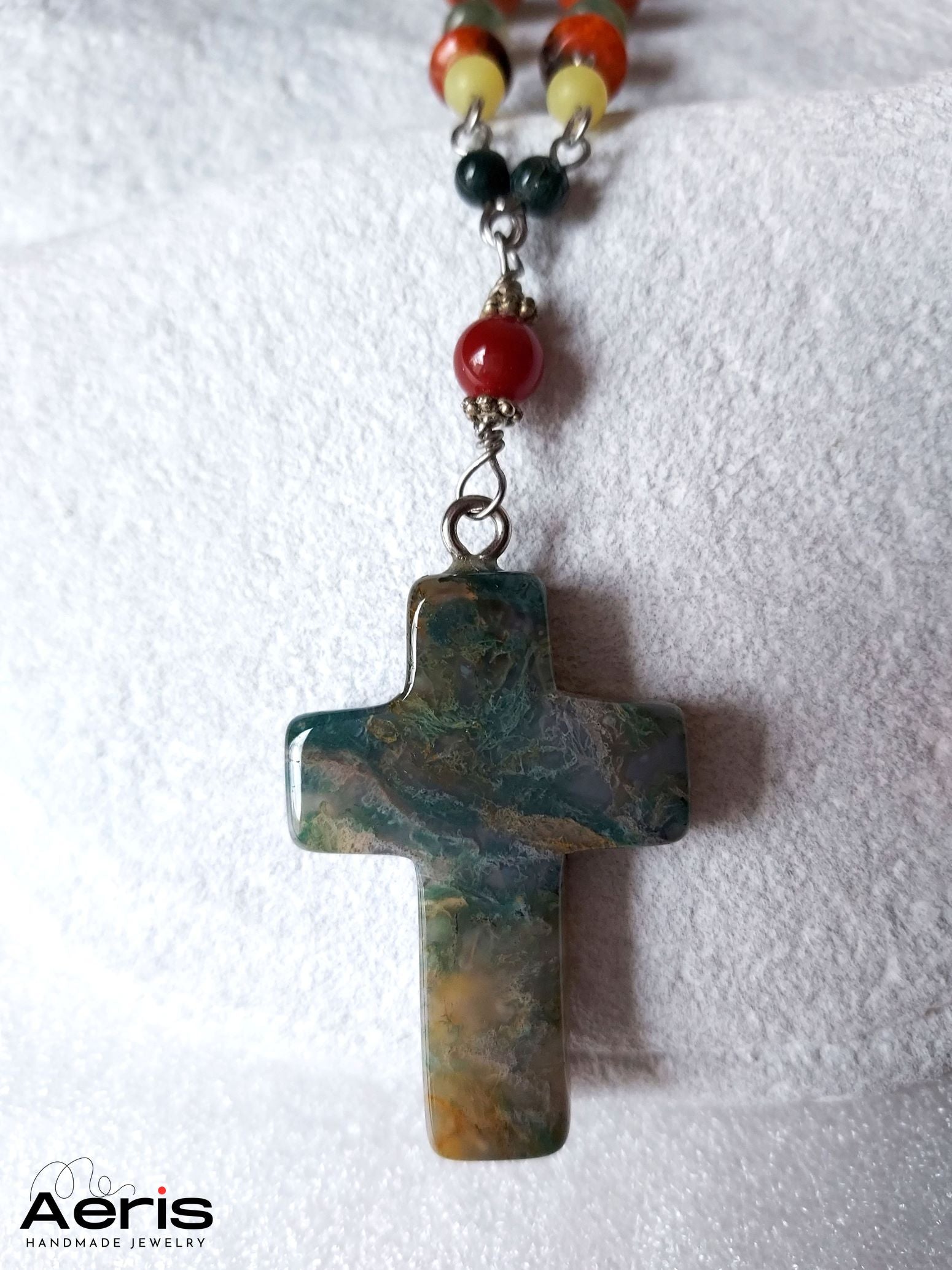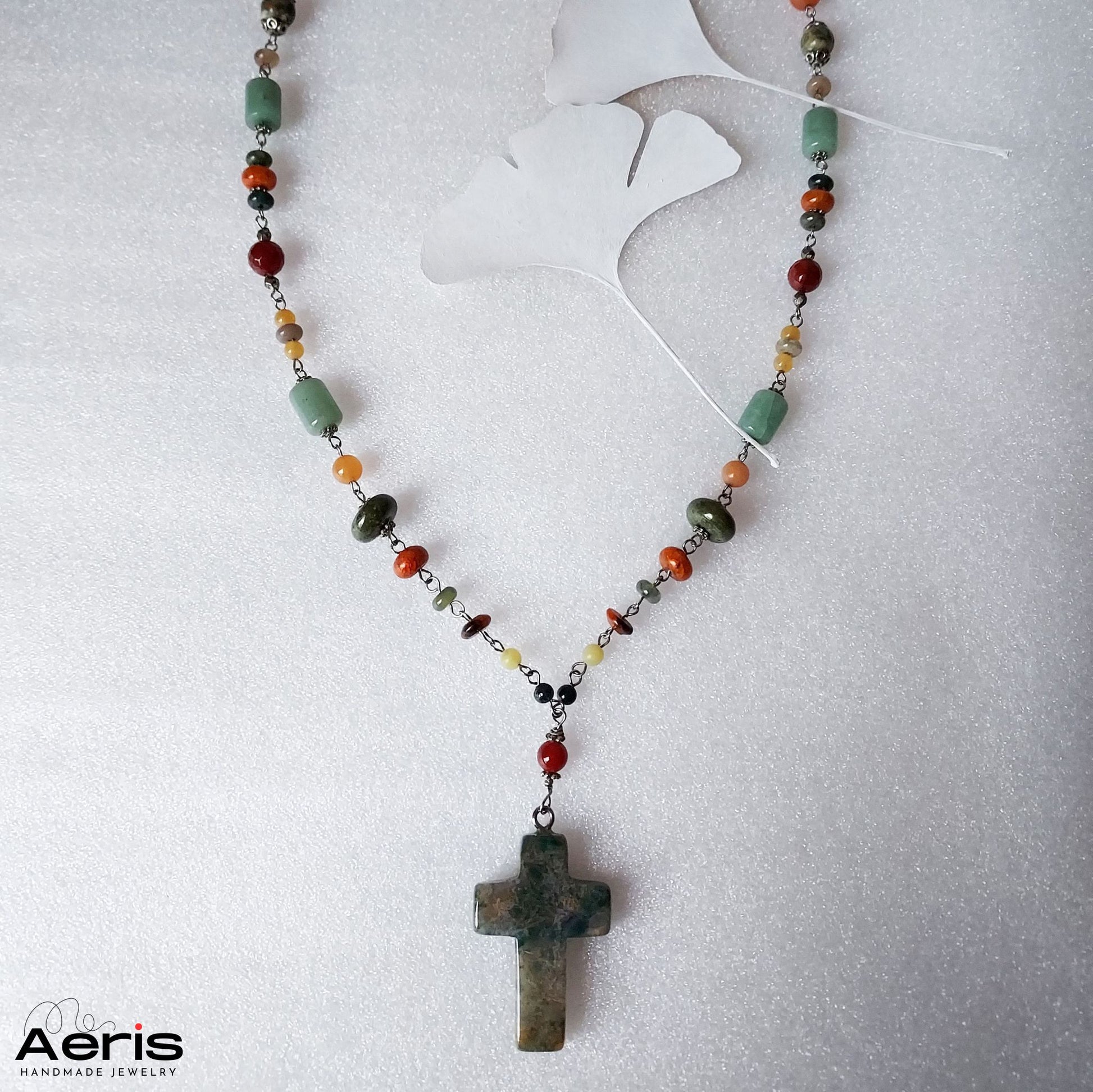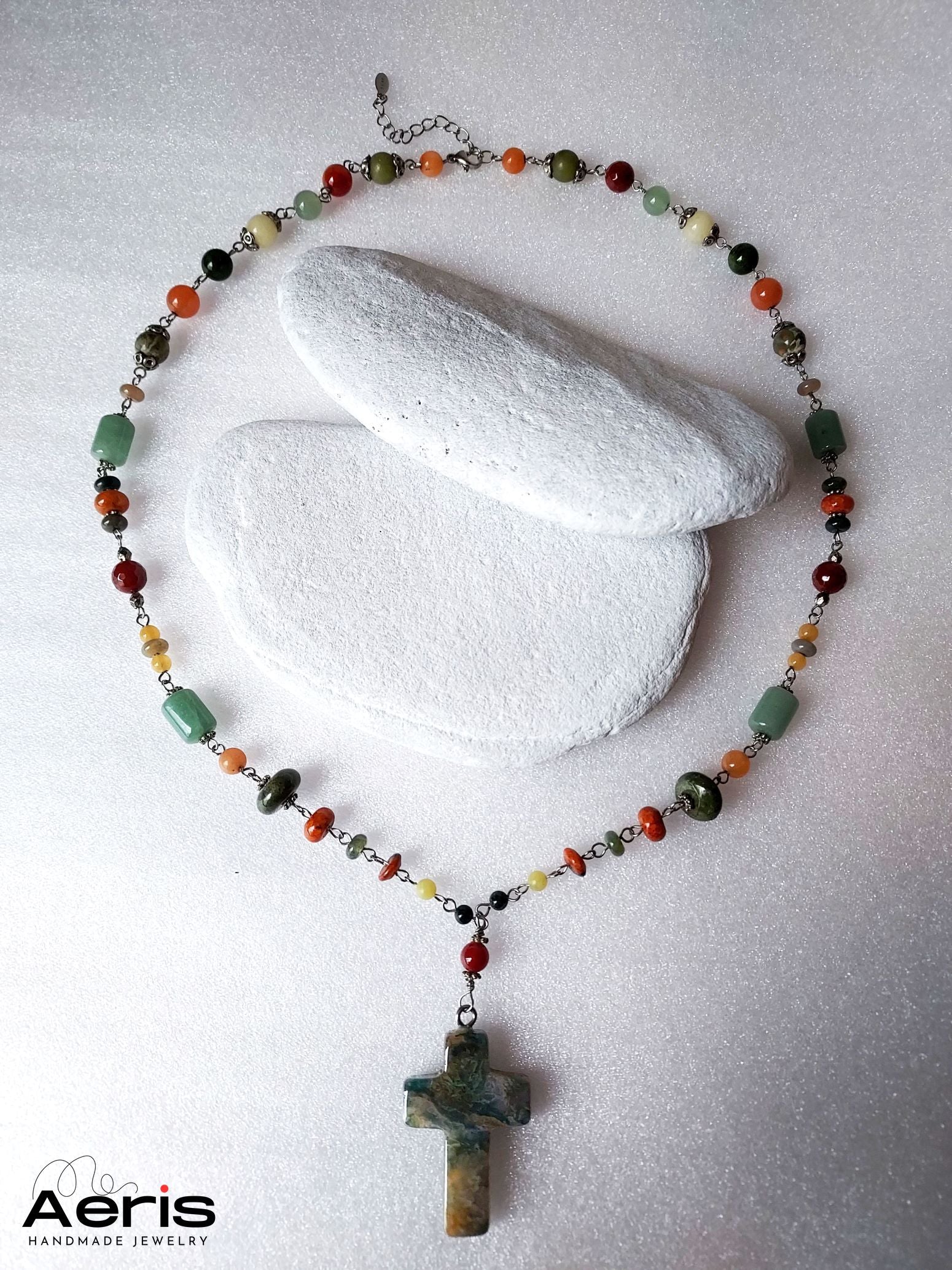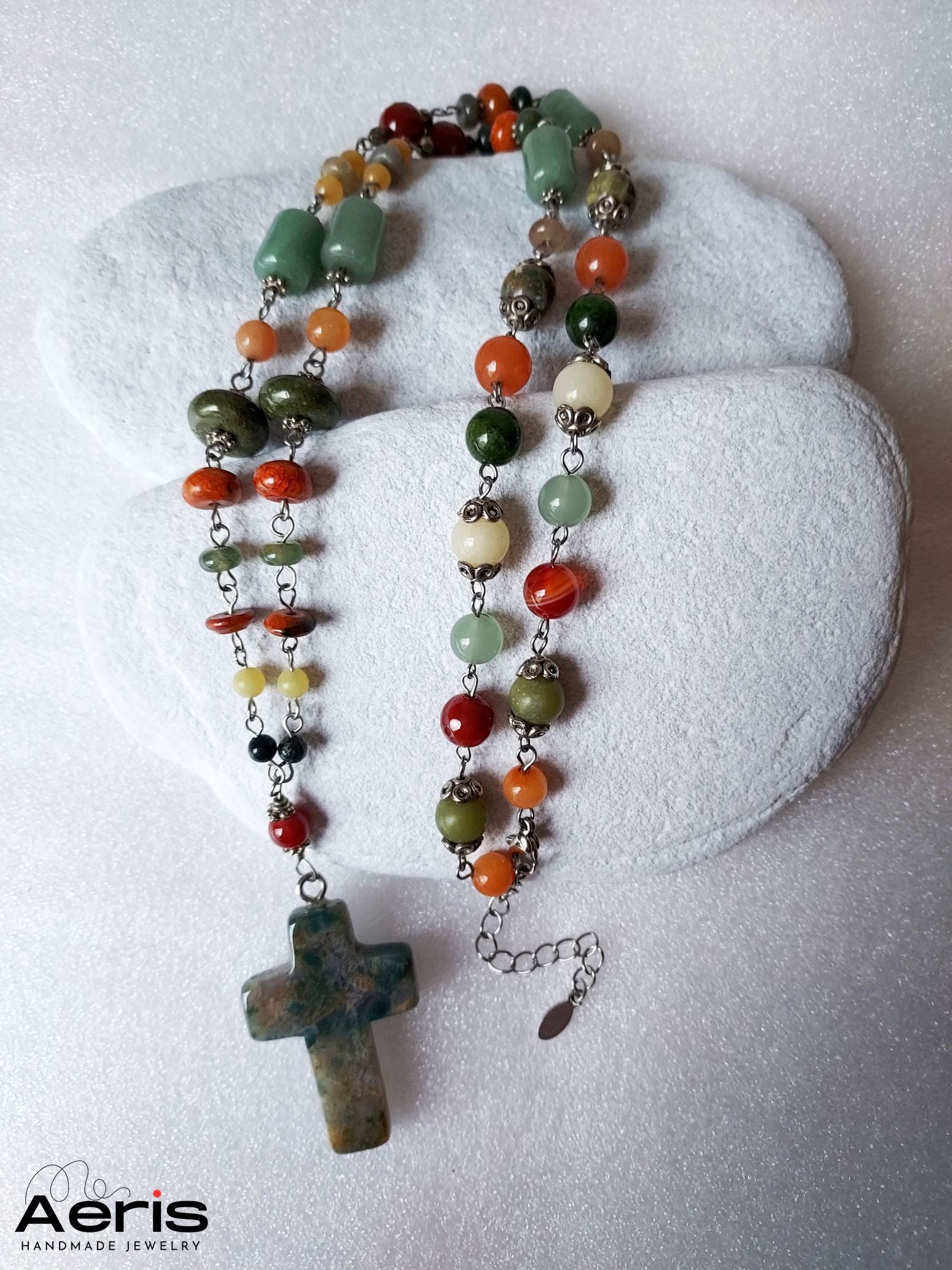 Opteaza pentru acest colier din margele semipretioase, alese cu grija intr-o armonie de culori, care se termina cu un pandantiv din agata indiana. Este foarte placut si confortabil de purtat, intrucat margelele sunt conectate individual prin zale din sarma de otel inoxidabil, ceea ce-i confera flexibilitate si gratie in timpul mersului.