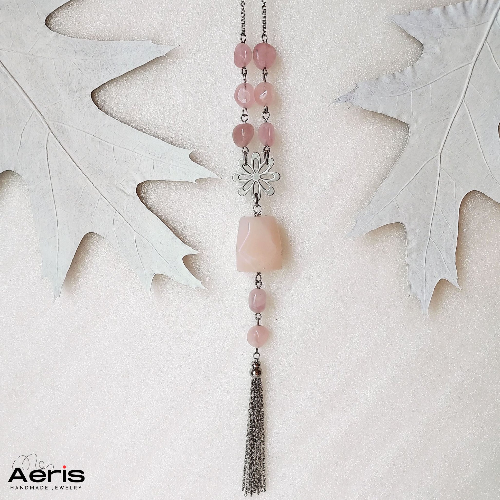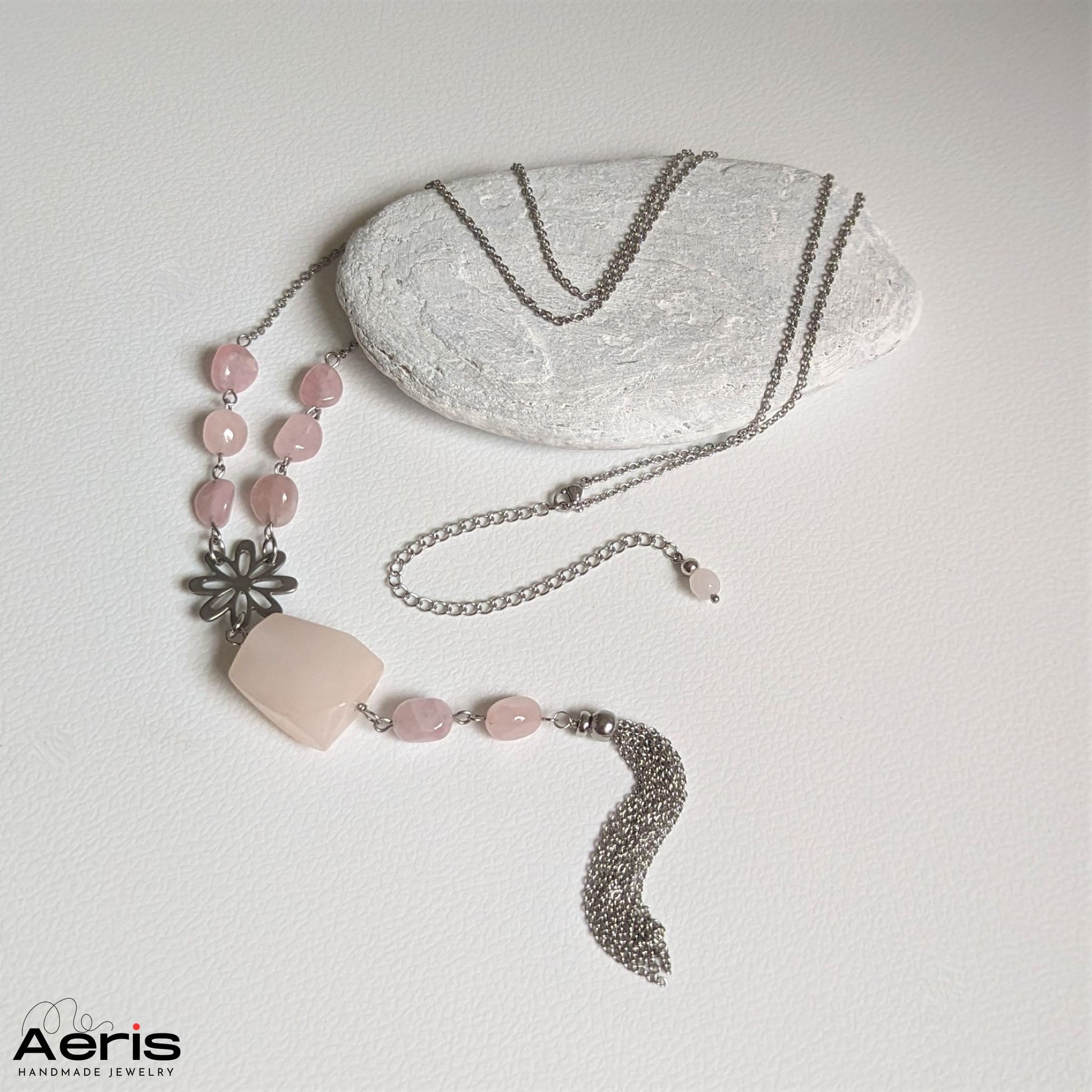 Colier realizat cu margele de cuart roz (de diferite forme si dimensiuni), finalizat cu un pandantiv cu piatra de cuart roz fatetata si un ciucure din lant care unduie cu eleganta in timpul mersului. Toate elementele metalice sunt din otel inoxidabil.