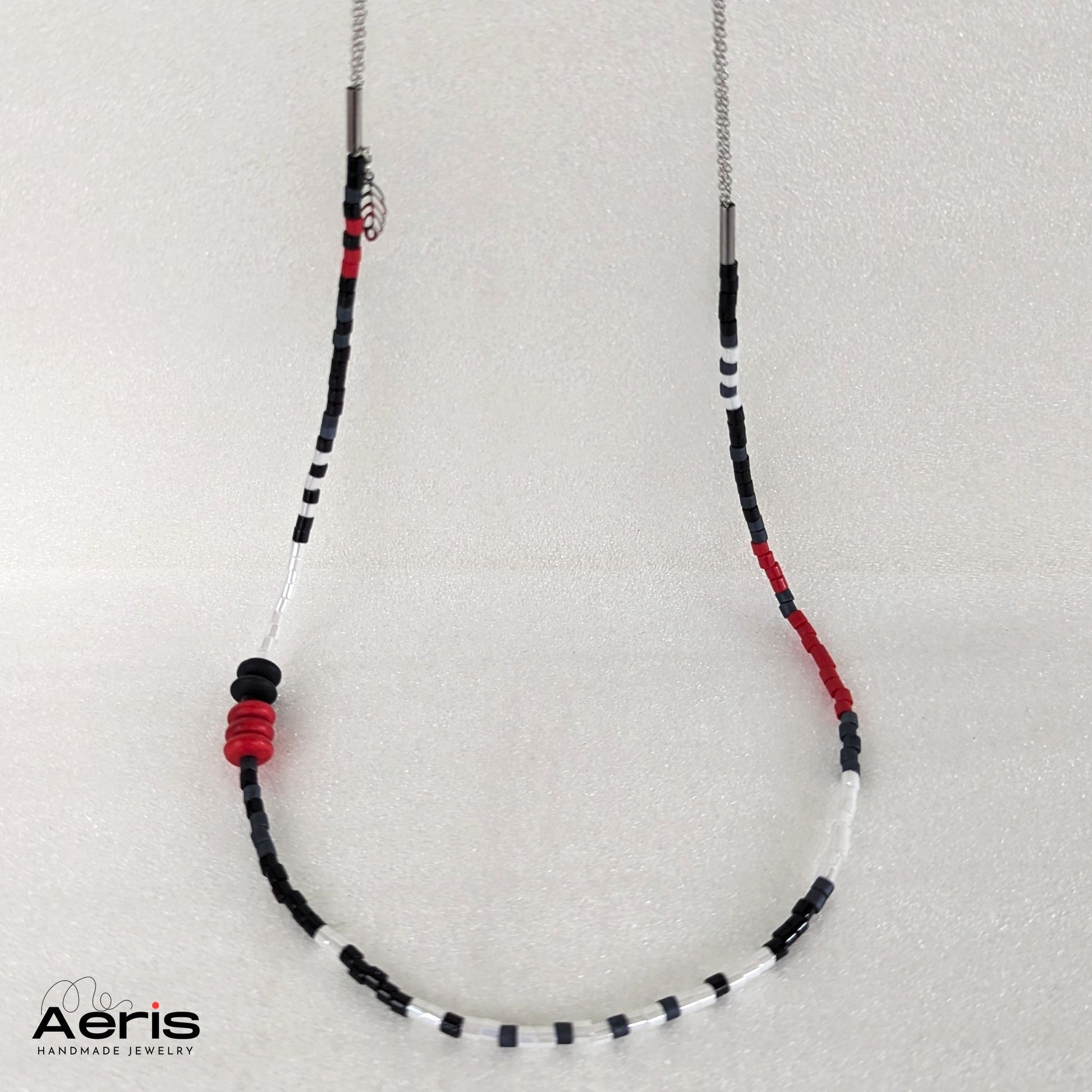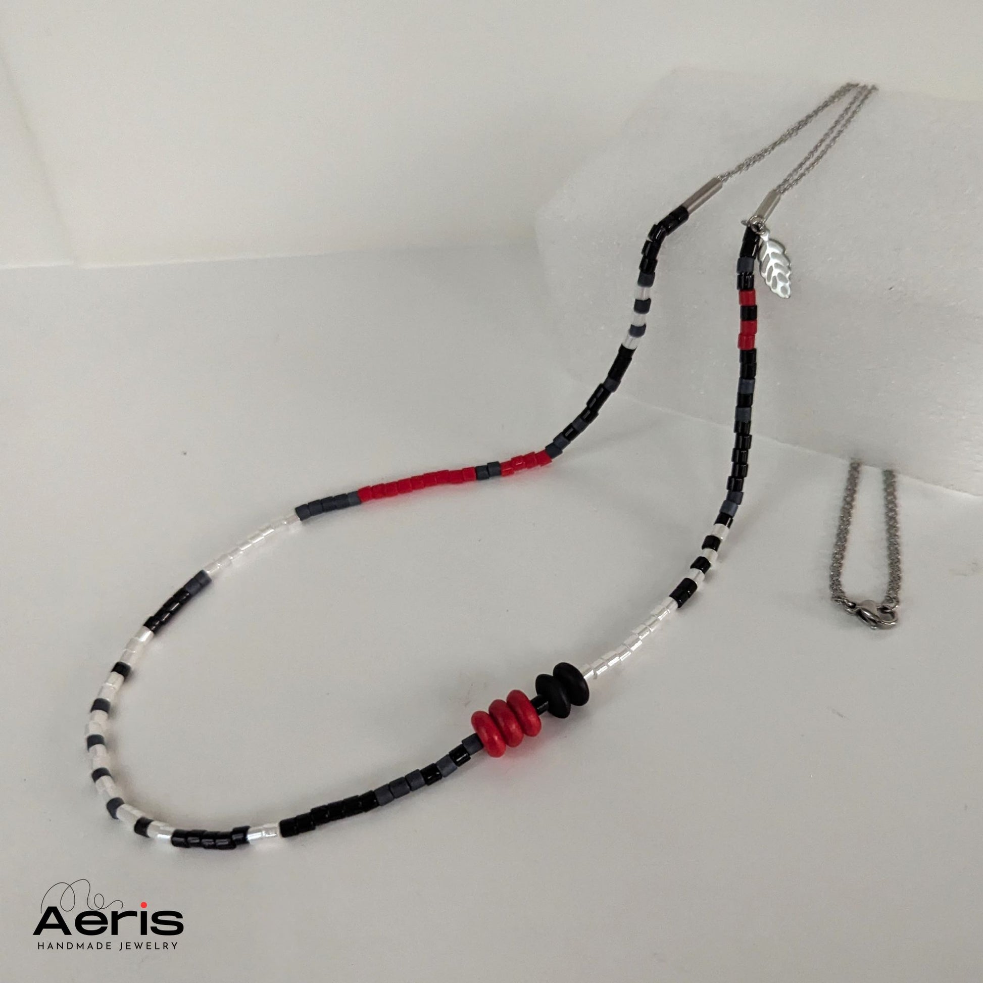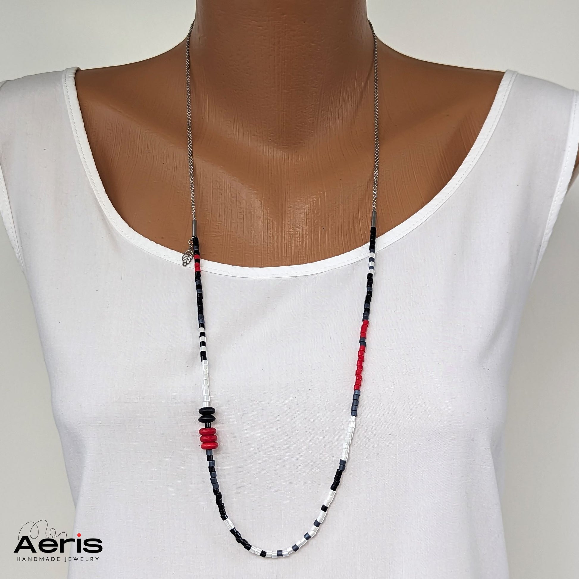 Cauti o aditie deosebita pentru tinuta ta? Acest colier modern si elegant, realizat din margele Miyuki Delica, rondele din howlit si onix mat poate fi o alegere inspirata.