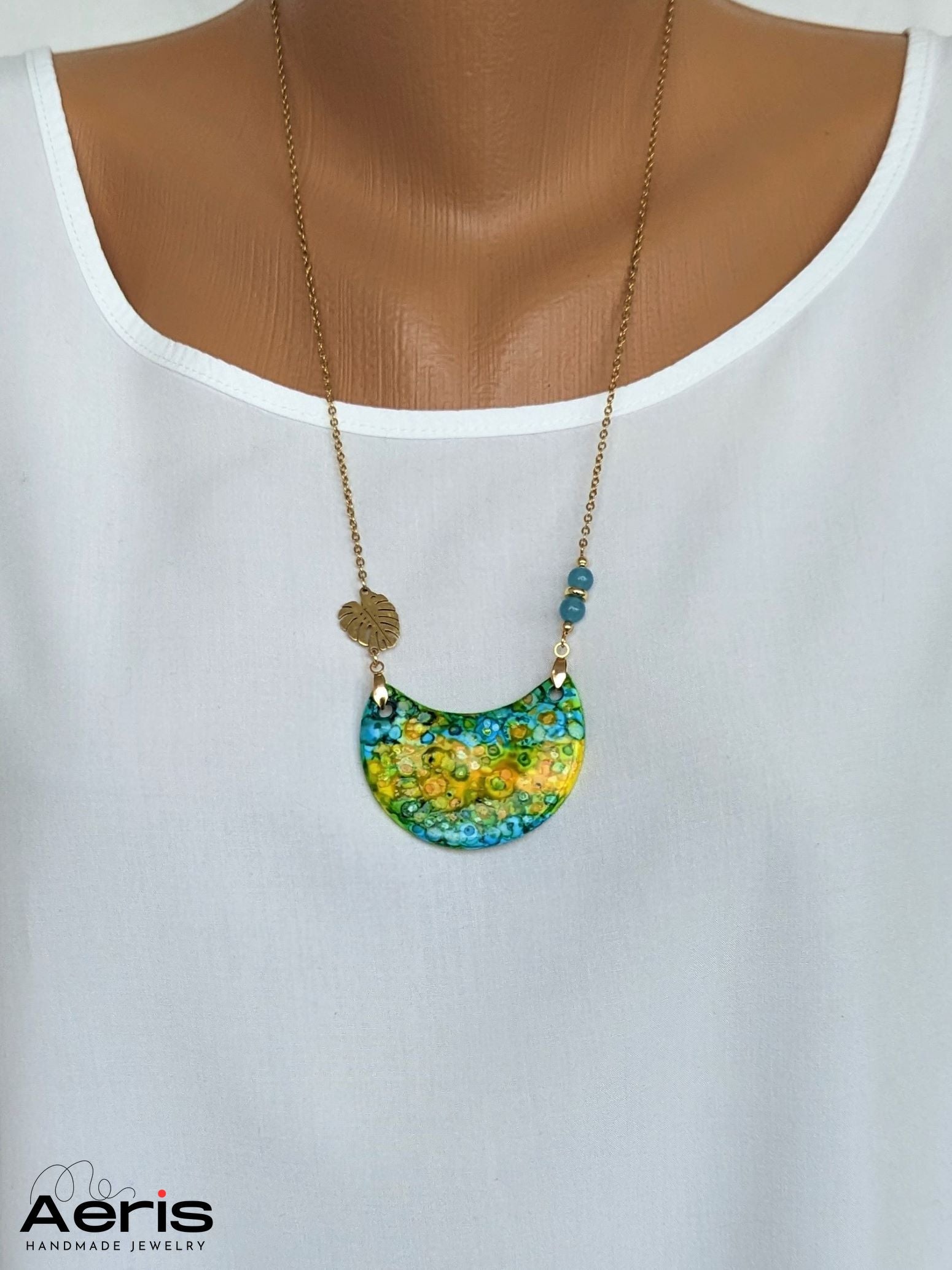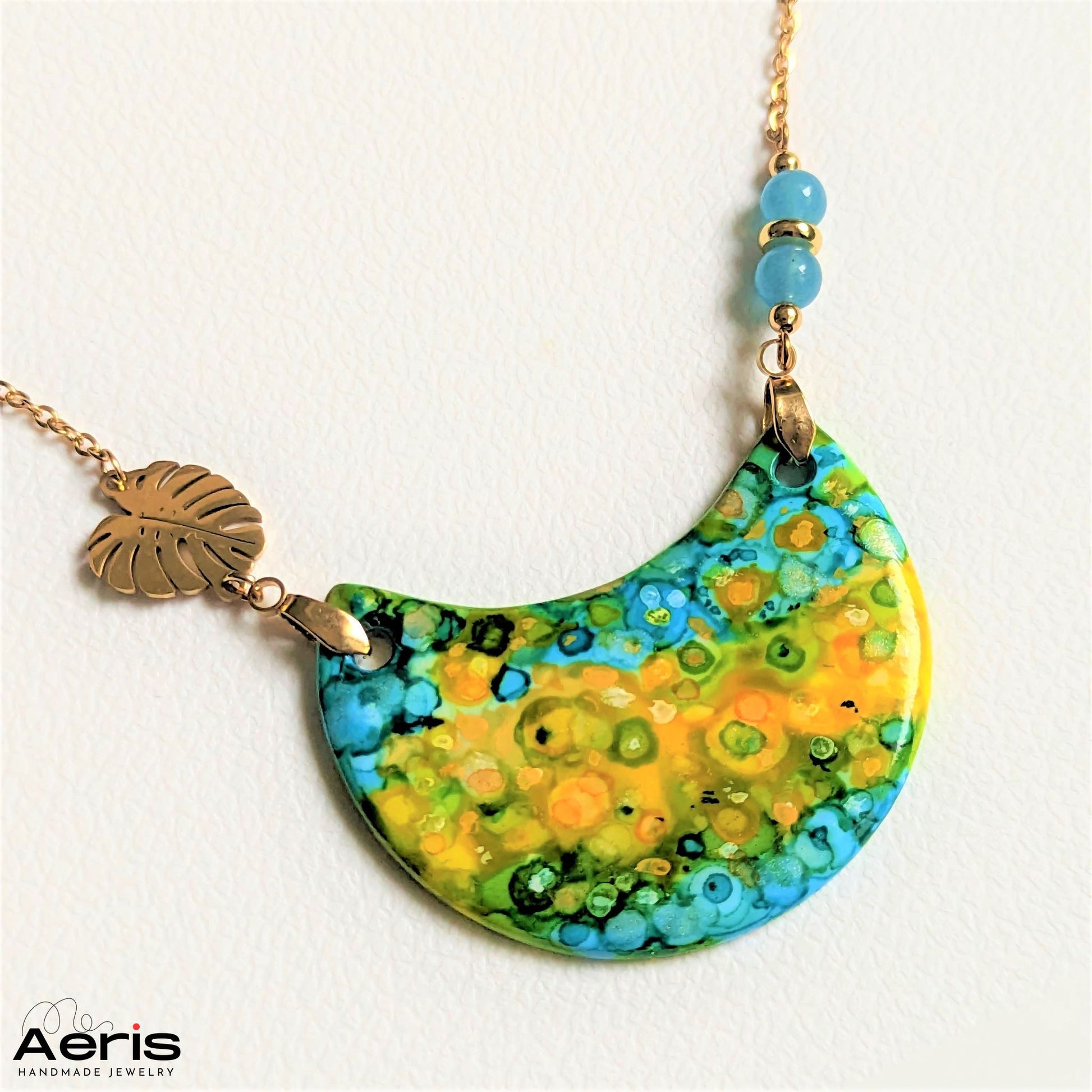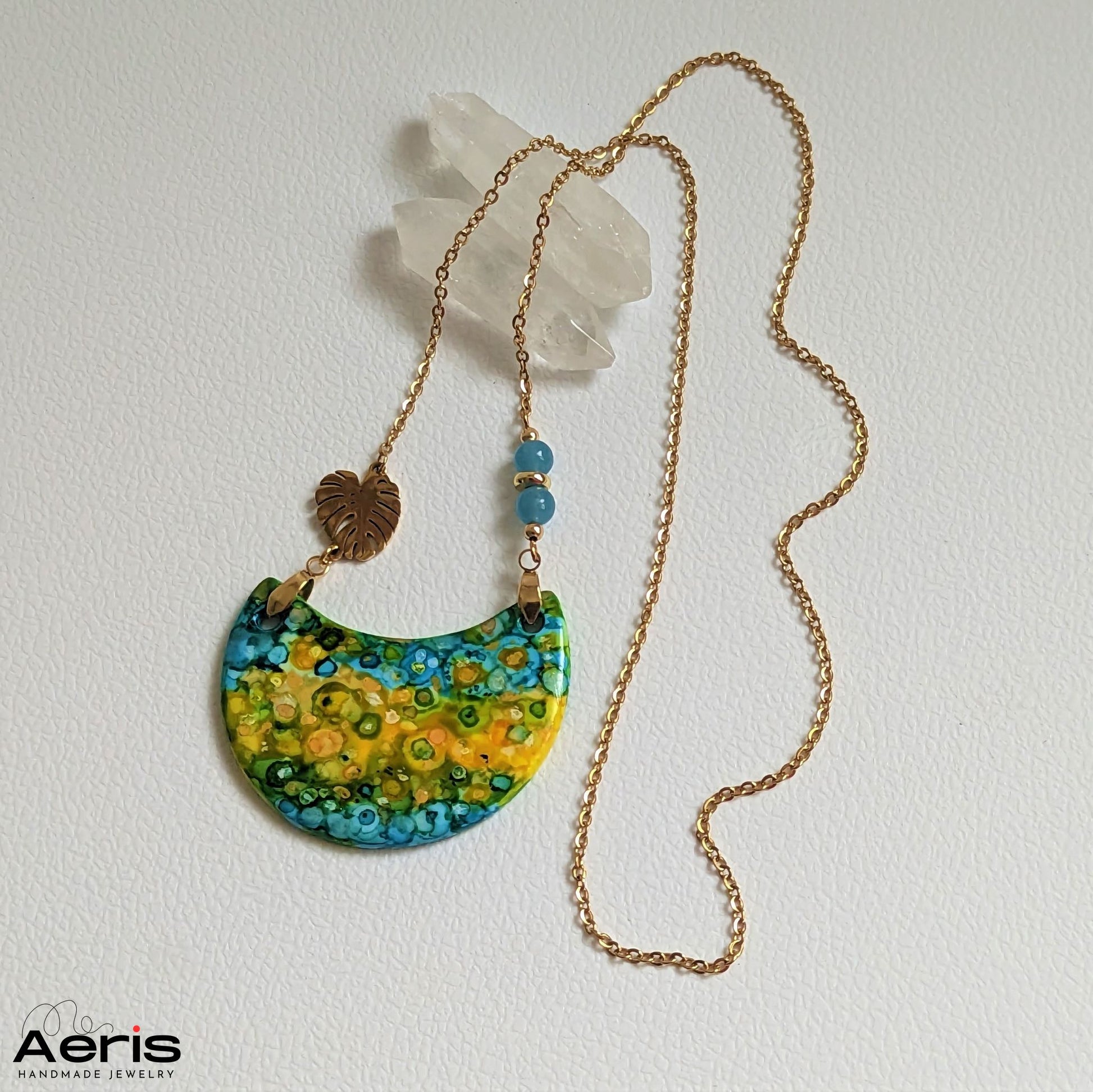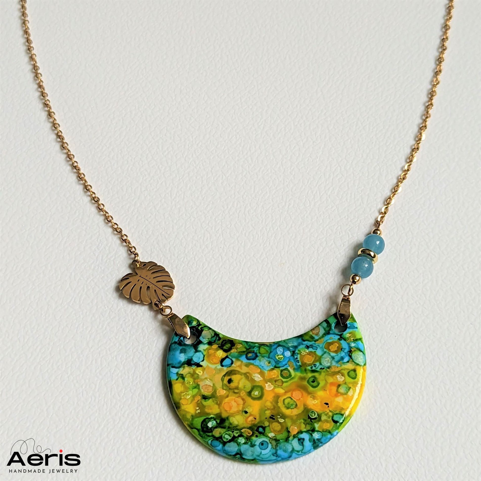 Adauga o nota originala outfitului tau cu acest colier realizat din margele de angelit si o piesa centrala din lut polimeric pictat manual in culori vibrante.