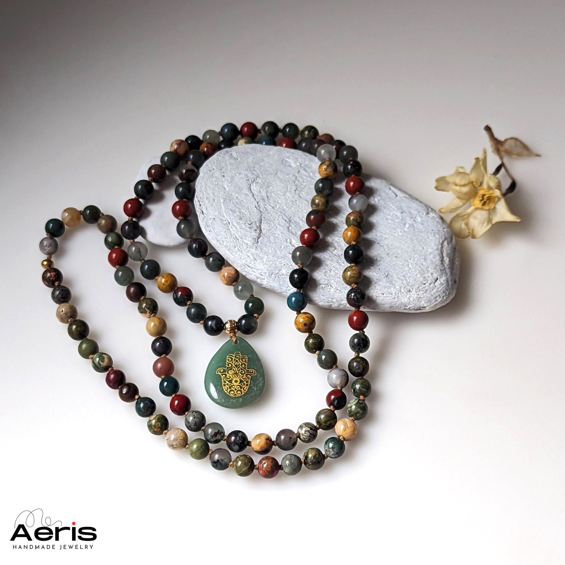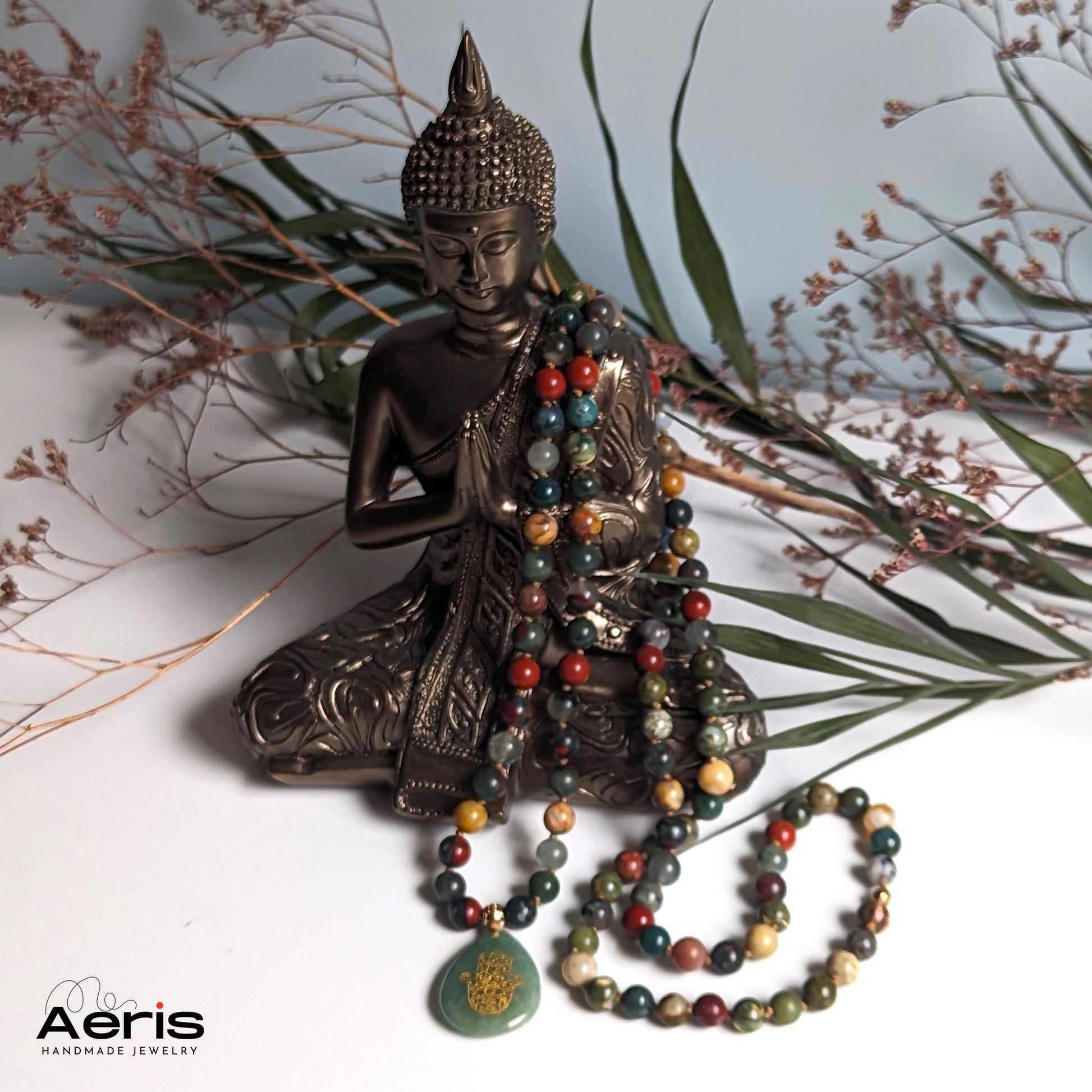 Opteaza pentru acest colier Mala realizat din 108 margele semipretioase (varietati de agate si jasp) de 7.5 mm, o margea (Buddha bead) aurie si finalizat cu un frumos pandantiv din aventurin, pe care este gravata cu auriu mana Hamsa.