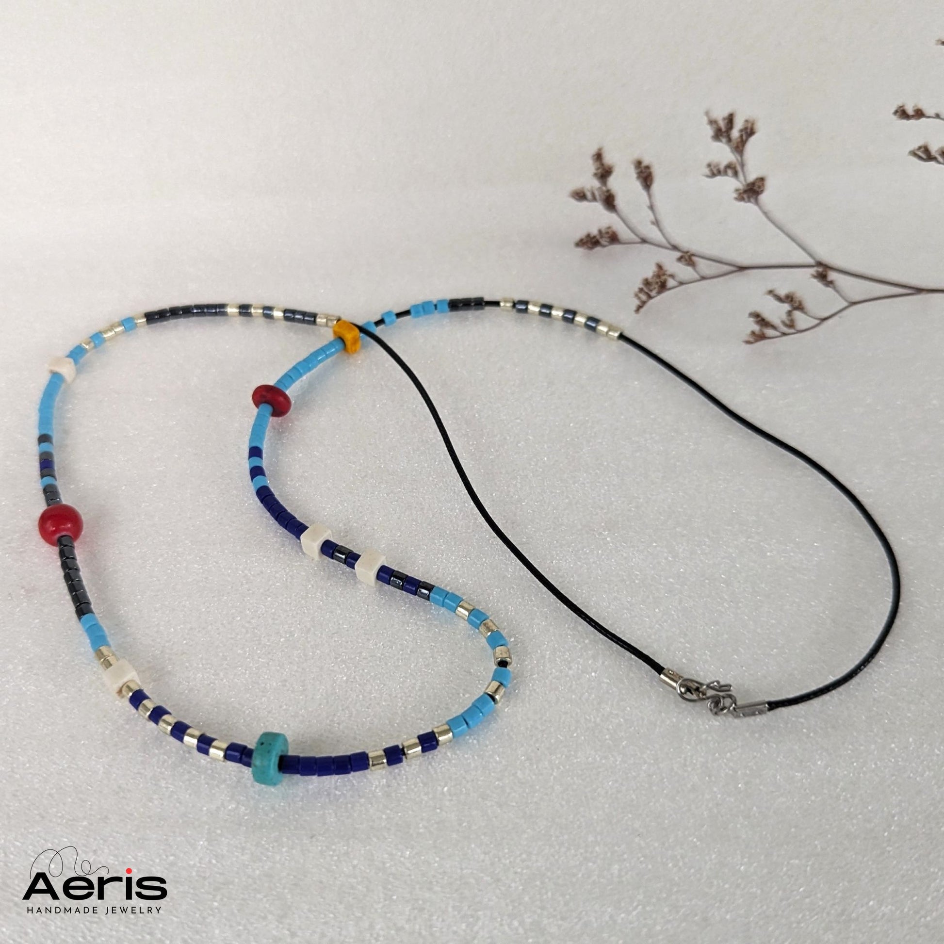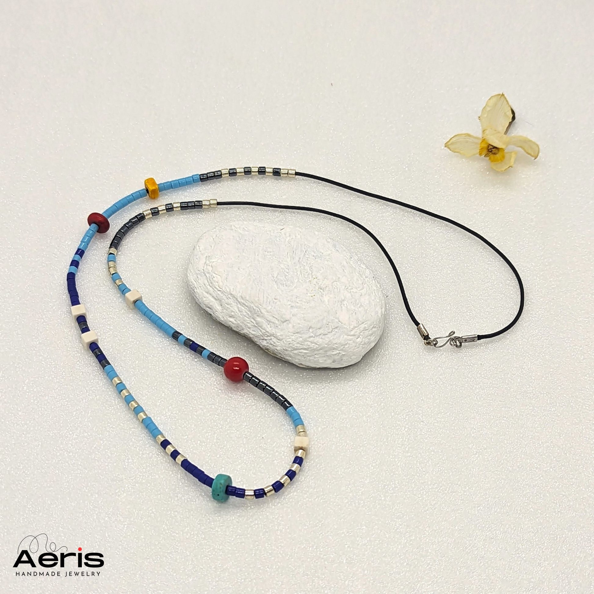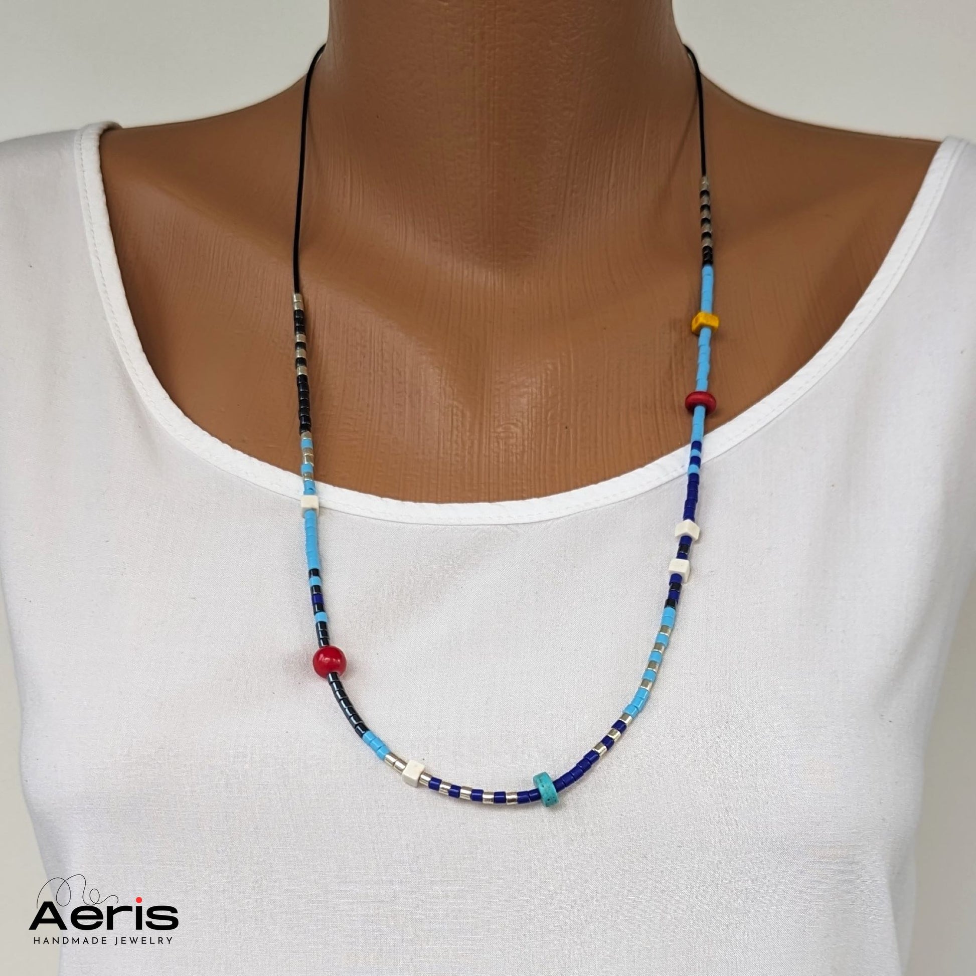 Adauga o nota vesela tinutelor tale cu acest colier modern, realizat din margele Miyuki Delica si margele din turcoaz, howlit de sinteza, scoica si ceramica.