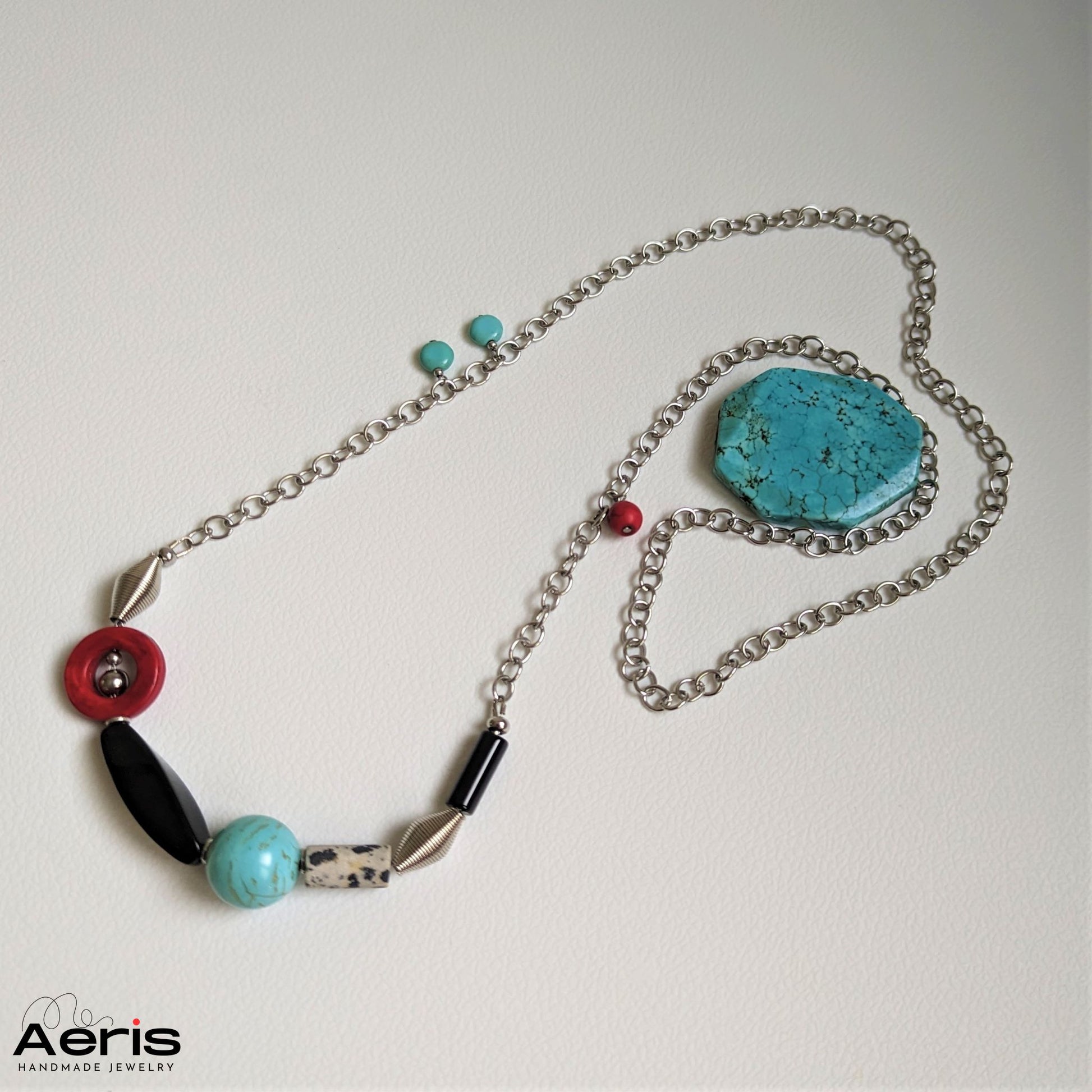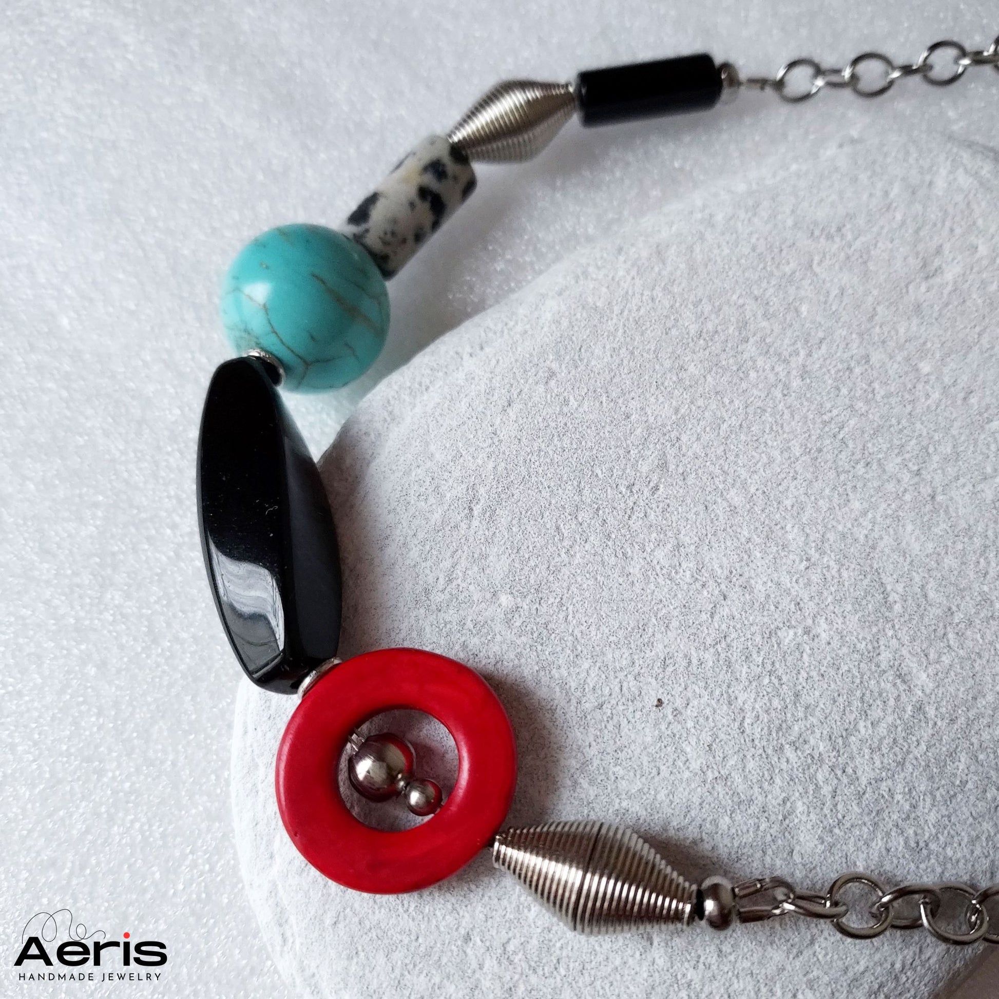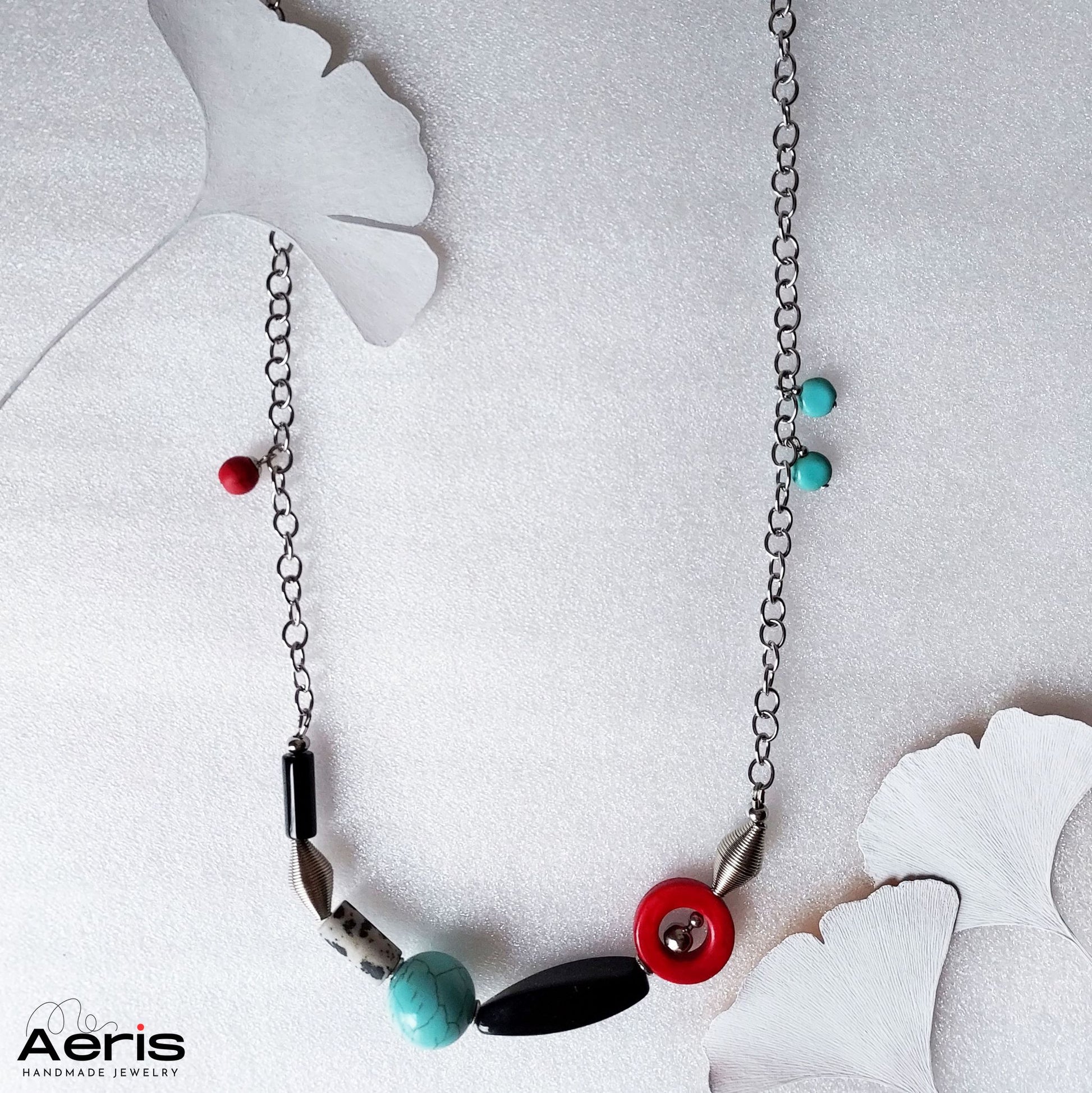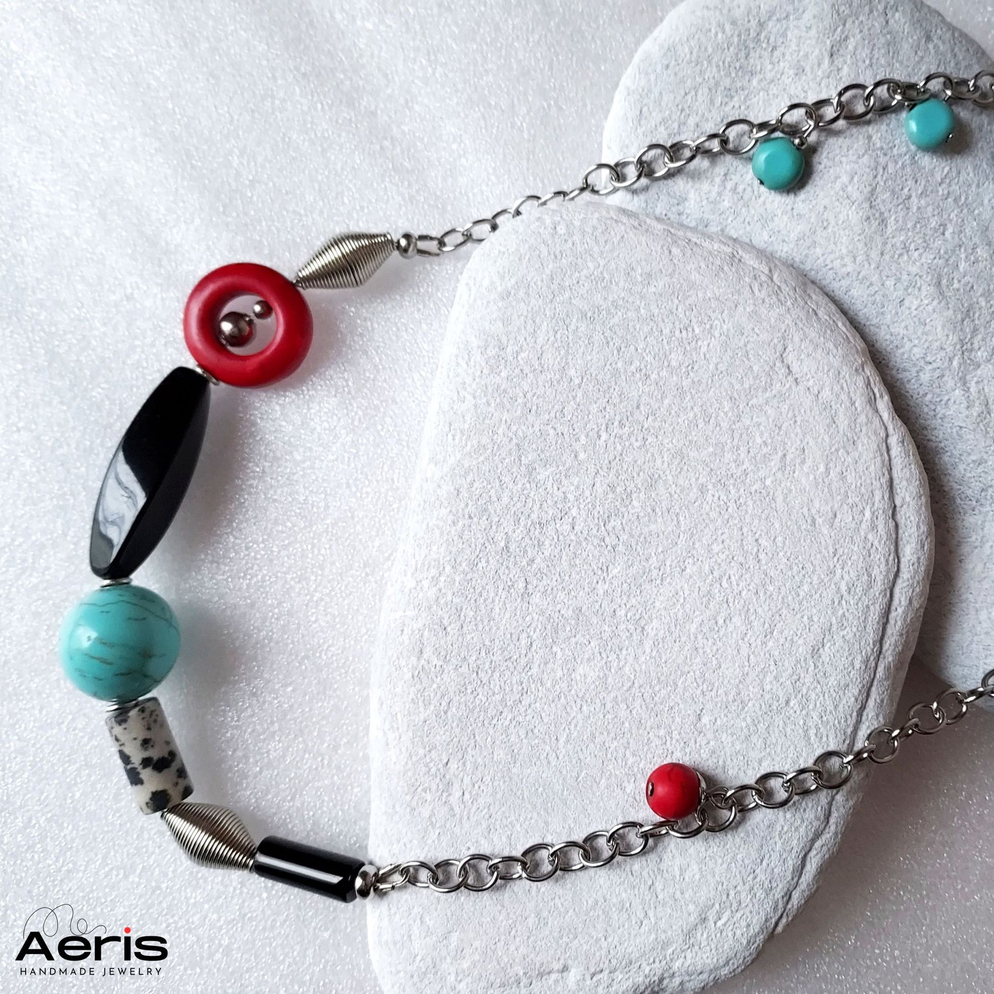 Acest colier modern si asimetric poate fi alegerea perfecta daca-ti doresti sa adaugi o nota aparte tinutelor tale. Este realizat din margele din pietre semipretioase de diferite forme si lant din otel inoxidabil. Colierul nu este prevazut cu inchizatoare, dar lungimea lantului se poate ajusta in functie de preferinte, fara alte costuri suplimentare.