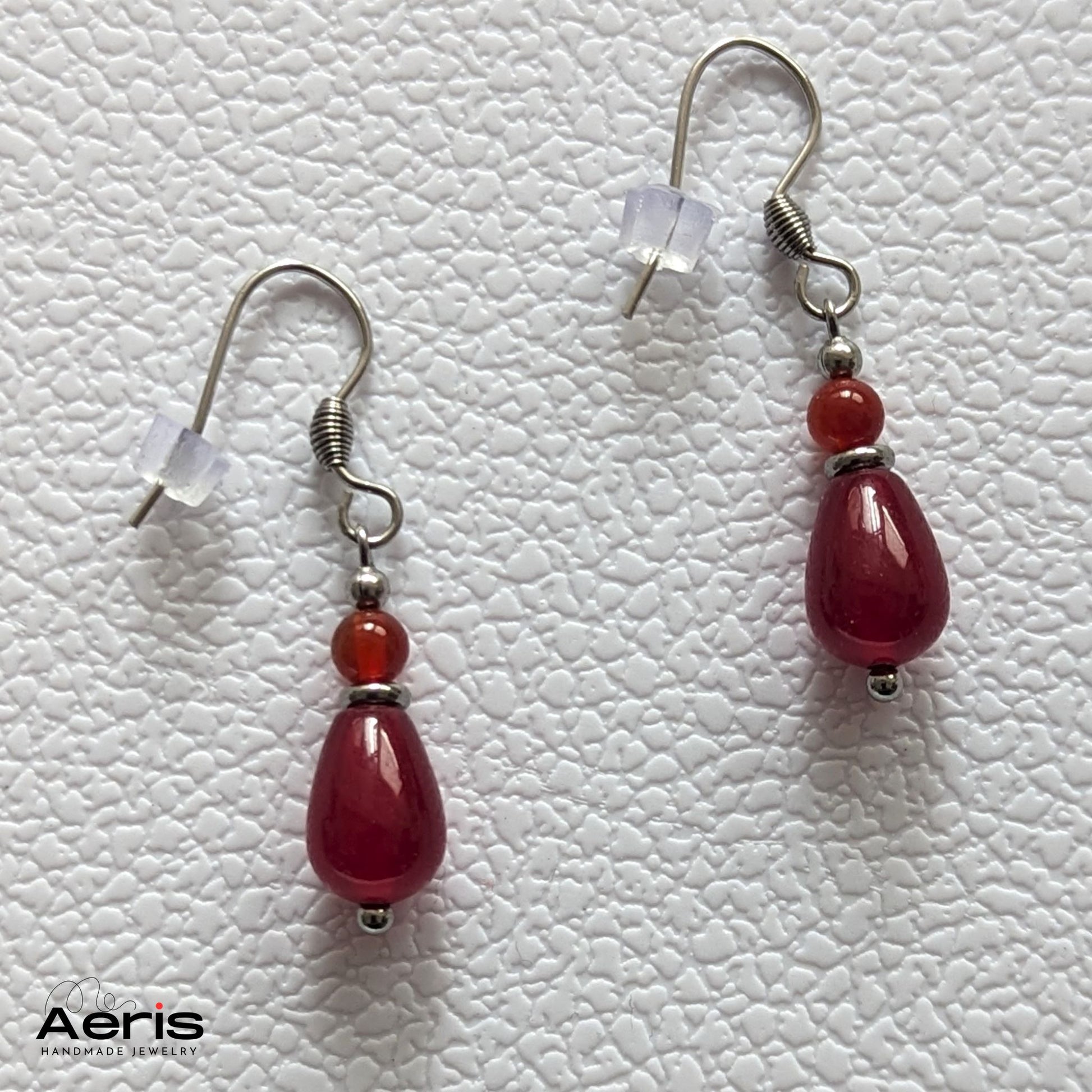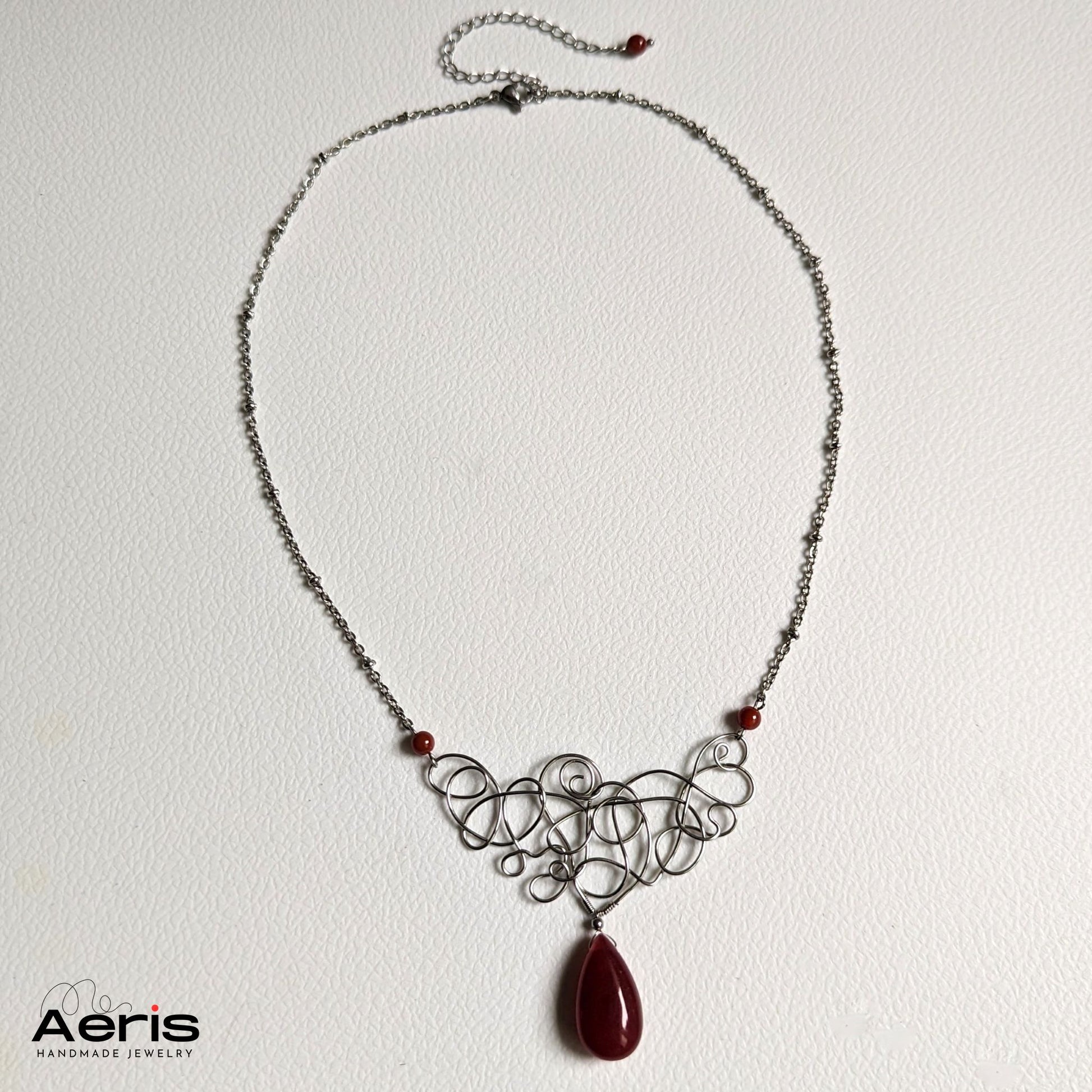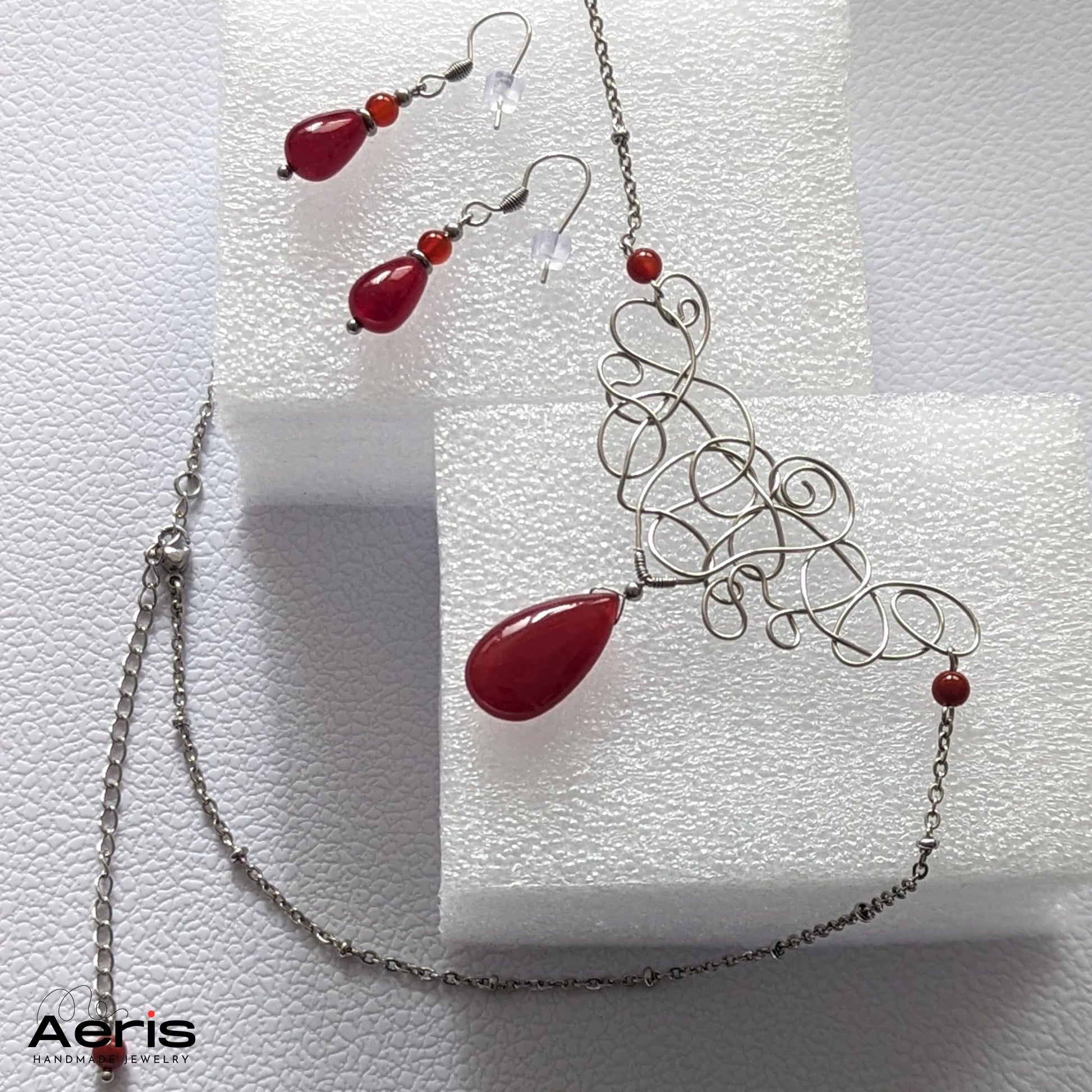 Adauga o nota de feminitate si farmec tinutelor tale cu acest set - realizat in tehnica freestyle wire wrapping - din sarma de otel inoxidabil chirurgical si margele din jad grena si carneol.